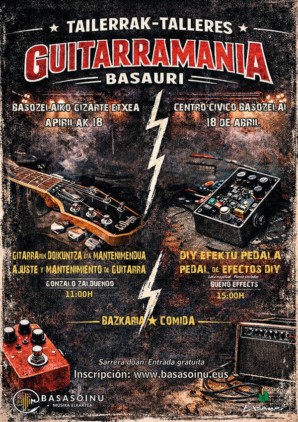 Basasoinu Musika Elkartea organiza una nueva edición de Guitarramania Basauri, dedicada a guitarristas y personas interesadas en el mundo del instrumento. En esta ocasión será una jornada completamente práctica que constará de dos talleres. El taller de la mañana será sobre los ajustes y el mantenimiento básico de la guitarra eléctrica y en el taller […]